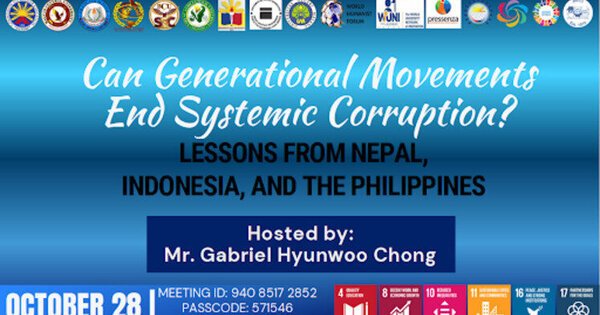 Korupsi bukanlah masalah baru-baru ini. Penyakit ini dimulai bertahun-tahun yang lalu, namun seiring berjalannya waktu, penyakit ini menjadi semakin buruk di sebagian besar negara di dunia. Tidak dapat disangkal bahwa Generasi Z berperan penting dalam perjuangan generasi ini melawan korupsi. Hal inilah yang menjadi inti diskusi yang diadakan pada tanggal 28 Oktober 2025, di mana perwakilan dari Nepal, Indonesia, dan Filipina berkumpul melalui forum online untuk menyampaikan pandangan berbeda mengenai pertanyaan, “Dapatkah Gerakan Generasi Mengakhiri Korupsi Sistemik?” Hadirin sebanyak 281 orang yang terdiri dari para pemimpin, perwakilan dari berbagai negara, aktivis perdamaian, mahasiswa, dan profesor.